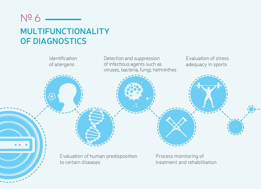 | Zakres częstotliwości | 5.51–5.58 GHz | Wykrywanie patologii poprzez rezonans bioelektryczny |